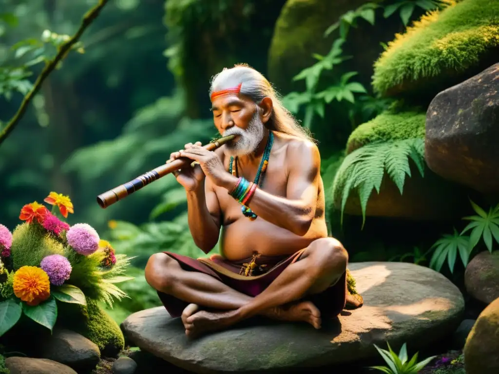 Un chamán tocando un instrumento musical tradicional en un entorno místico y curativo, evocando la influencia de la música y el canto tradicional