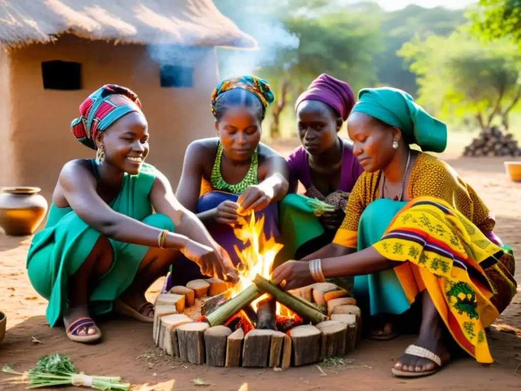 Un grupo de mujeres africanas se reúnen alrededor de un fuego, preparando medicina tradicional africana